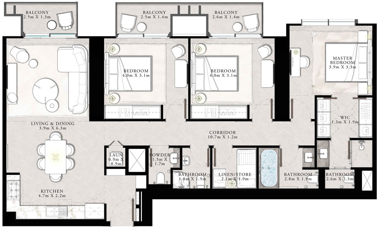 Within walking distance, residents will find Spinneys and Carrefour supermarkets, upscale cafes, pharmacies, salons, and fitness clubs. Families with children will enjoy prestigious educational institutions, including Blossom Nursery and GEMS Wellington Primary School. Cultural enthusiasts will appreciate Dubai Opera, The Dubai Fountain, and the region's largest shopping and entertainment centre, Dubai Mall, all within a 10-minute walk. Dubai International Airport is about 20 minutes away, while Al Maktoum International Airport is approximately 40–45 minutes away, so the location is particularly convenient for frequent travellers.